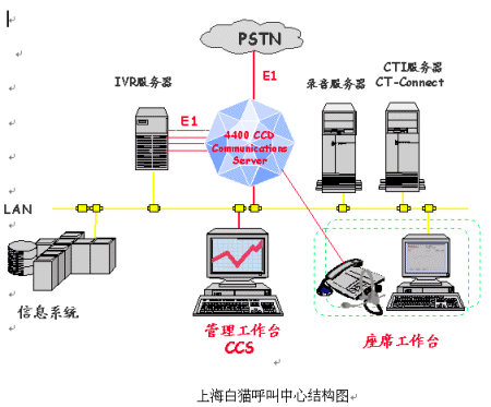 隨著企業(yè)間相互競爭的加劇,用戶對企業(yè)服務要求的提高,越來越多的企業(yè)承諾為用戶提供一個24小時的客戶服務環(huán)境,用戶可以隨時獲得聲音、文字、文件等服務。而呼叫中心可為企業(yè)解決這些問題。阿爾卡特作為著名的企業(yè)通信產(chǎn)品供應商,可以為企業(yè)提供一套完整的多媒體呼叫中心平臺解決方案。上海白貓有限公司是國內(nèi)著名的洗滌系列產(chǎn)品供應商,提供多種渠道為分銷商和用戶提供產(chǎn)品和服務。面對競爭對手,面對客戶的要求,上海白貓決定建設電子商務平臺,通過電話、傳真、郵件、網(wǎng)站各種接入手段,結(jié)合公司的物流系統(tǒng),倉庫管理,網(wǎng)站系統(tǒng),建立客戶關(guān)系管理,經(jīng)營策略分析。從而鞏固其在同行業(yè)的地位,獲得更大的競爭力。阿爾卡特為上海白貓有限公司提供OmniPCX 4400交換機解決方案。采用CCD排隊軟件,采用CCS呼叫管理軟件。CTI中間件采用CT-Connect。