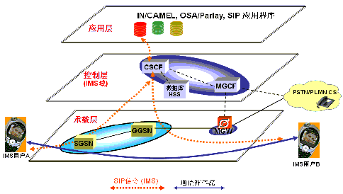 VPN等。圖中以移動分組網(wǎng)的承載方式為例,描述了IMS用戶通過手機進(jìn)行IMS會話的方式,主要的承載層設(shè)備有SGSN、GGSN,以及媒體網(wǎng)關(guān)MGW。SGSN和GGSN可以完全重用現(xiàn)網(wǎng)設(shè)備,不需要硬件升級,僅通過做相關(guān)配置就可以支持IMS了。MGW是負(fù)責(zé)媒體流在IMS域和CS域互通的功能實體,主要解決話音互通問題。無論具體采用哪一種接入方式,只要基于IP技術(shù),所有的IMS用戶信令就可以很好地傳送到控制層。