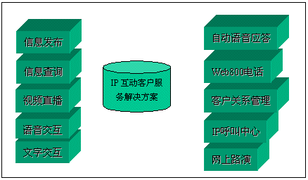 經(jīng)過對比分析,我們發(fā)現(xiàn),目前國際國內(nèi)市場上很多客戶服務(wù)產(chǎn)品,大都僅僅完成客戶服務(wù)的一部分。北極星“IP互動客戶服務(wù)中心解決方案”則引入互動客戶服務(wù)(ICS:Interactive Customer Service)系統(tǒng)以及數(shù)碼互動直播的概念,形成了由視頻點播、網(wǎng)上路演、語音和文字交互、IP客戶服務(wù)中心、Web800語音電話、實時服務(wù)中心、專家實時在線、客戶關(guān)系管理、在線尋呼系統(tǒng)和客戶社區(qū)服務(wù)系統(tǒng)等全方位的服務(wù)內(nèi)容。該方案主要基于IP架構(gòu),系統(tǒng)擴展性非常靈活,系統(tǒng)體現(xiàn)的客戶服務(wù)思想非常能夠滿足我們的需求。2001年3月,經(jīng)過一段時間的試運行后,我們正式推出了這套“IP互動客戶服務(wù)”系統(tǒng)。