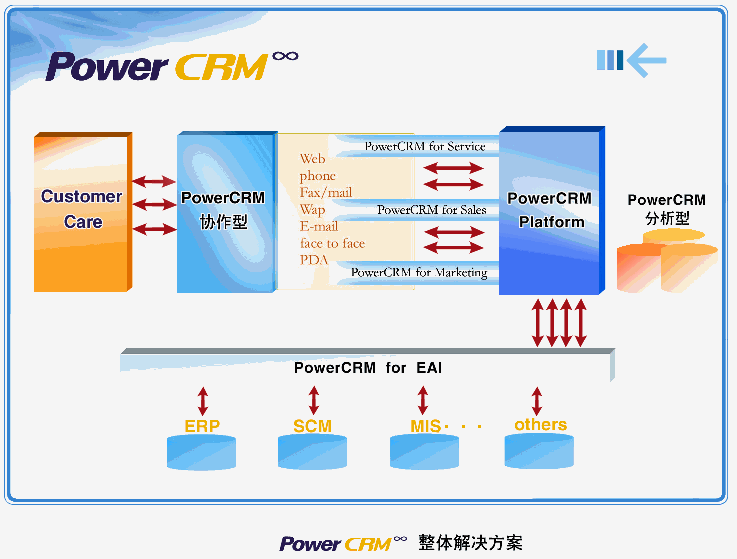 創(chuàng)智集團(tuán)投入巨資,推出的PowerCRM是一套完全基于WEB方案的企業(yè)級的客戶關(guān)系管理應(yīng)用系統(tǒng)。是中國第一款自主開發(fā)的具有大容量數(shù)據(jù)處理能力,具有大型系統(tǒng)定制能力,針對中高端用戶、大型企業(yè)(通信行業(yè)、金融、證券、保險(xiǎn)行業(yè)、制造業(yè)、零售業(yè)、服務(wù)行業(yè)、顧問咨詢行業(yè)、IT行業(yè)等)解決方案,是國家計(jì)委高技術(shù)產(chǎn)業(yè)化示范工程。盡管已有不少國內(nèi)軟件廠商紛紛推出自己的CRM,但僅停留在“入門級”水平,只能為中小企業(yè)提供傳統(tǒng)的、以運(yùn)營型為主的CRM解決方案,雖然也可以幫助企業(yè)用戶處理好客戶關(guān)系,提高工作效率,但難以帶來贏利。PowerCRM將自己主要的競爭對手定位于Siebel, Oracle等知名的國際級公司的產(chǎn)品。同過不斷地優(yōu)化產(chǎn)品設(shè)計(jì),爭取奉獻(xiàn)給國內(nèi)企業(yè)客戶功能最強(qiáng)大,性能價(jià)格比最高,最符合中國企業(yè)特色的CRM產(chǎn)品。