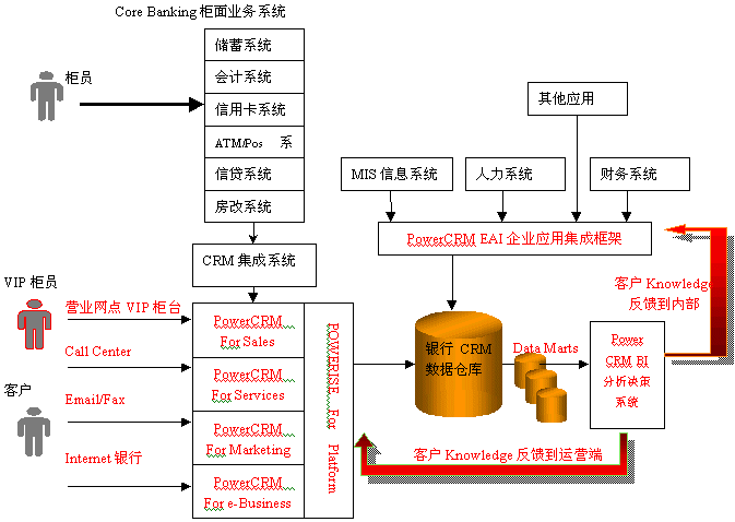 利用PowerCRM的銀行分析型CRM解決方案,對客戶信息進(jìn)行全面的分析,從而挖掘出許多客戶知識(shí),繼而制定和改進(jìn)相應(yīng)的市場策略,應(yīng)用于PowerCRM運(yùn)營型CRM系統(tǒng)中,更好地指導(dǎo)營銷人員為客戶服務(wù)和完善客戶服務(wù)流程;同時(shí)也需要反饋到銀行內(nèi)部系統(tǒng),用于增強(qiáng)銀行內(nèi)部的運(yùn)營效率。