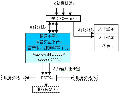 適用于中小型企事業(yè)單位的分布式客戶服務(wù)系統(tǒng)。特點(diǎn)是一半的線路資源用于交互系統(tǒng),另一半線路資源用于向分布下達(dá)服務(wù)指令。采用該方案的最大好處就是用戶的服務(wù)請求能夠以最快的速度自動(dòng)分配到最合適的服務(wù)分站中,再由服務(wù)分站根據(jù)客戶的具體要求執(zhí)行服務(wù)。