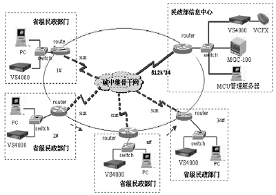 構(gòu)成此次民政部門視頻會議系統(tǒng)的主要設(shè)備是PolyCom公司的MGC-100多點控制單元(MCU)和VS4000機(jī)架式視頻終端。