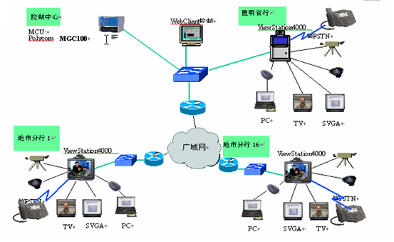云南省中國(guó)銀行主會(huì)場(chǎng)放置1臺(tái)MGC-100 MCU和1臺(tái)視訊會(huì)議終端ViewStation4000,1套雙流模塊;其他16個(gè)地市各放置1臺(tái)視訊會(huì)議終端ViewStation4000,1套雙流模塊。MCU和視訊終端通過以太網(wǎng)交換機(jī)接入傳輸網(wǎng)絡(luò),根據(jù)各分地市網(wǎng)絡(luò)實(shí)際帶寬,視頻會(huì)議的帶寬定為2M。