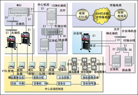 設(shè)備選用VTEL美國(guó)視訊公司銀河(Galaxy)755型視訊終端設(shè)備。該設(shè)備基于開放式的PC界面,操作簡(jiǎn)單、升級(jí)容易,具有強(qiáng)大的多媒體和數(shù)據(jù)傳輸功能;具有先進(jìn)的網(wǎng)絡(luò)管理功能;可靈活與局域網(wǎng)或與Internet相連接;設(shè)有多種連接端口;智能化程度較高。多點(diǎn)會(huì)議服務(wù)器MCU設(shè)備具有較強(qiáng)網(wǎng)絡(luò)適應(yīng)能力,可連續(xù)開機(jī)工作,運(yùn)行穩(wěn)定。北京法院電視會(huì)議系統(tǒng)由1臺(tái)24點(diǎn)MCU設(shè)備和24臺(tái)VTEL銀河755型電視會(huì)議終端設(shè)備組成。