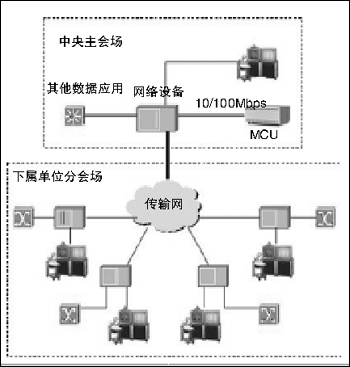 各節(jié)點的接入采用一條512Kbps帶寬的DDN/E1線路接入本地電信公司;在總部采用集中式接入中央電信公司,接入中心的電路帶寬應該是多條信道捆綁的帶寬,中心節(jié)點交換機采用10/100Mbps與MCU相連,總部主會場的視頻終端通過接入交換機與MCU進行通信。