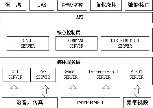 需要指出的是,由于ICSYS智能平臺(tái)系統(tǒng)采用了媒體服務(wù)層,上述所有Internet 呼叫事件都統(tǒng)一發(fā)送到系統(tǒng)核心層,所有呼叫的路由都由核心層Distribution Server來(lái)統(tǒng)一分配,從而保證了多種媒體的統(tǒng)一接入和統(tǒng)一排隊(duì)。三 商業(yè)應(yīng)用