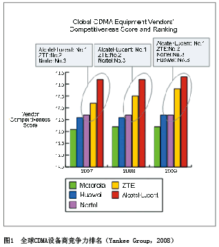 All-IP上的領(lǐng)先地位的進(jìn)一步鞏固,中興通訊已經(jīng)成為全球CDMA的領(lǐng)導(dǎo)者, Yankee group 2008年的一份咨詢報(bào)告顯示,中興通訊CDMA綜合排名穩(wěn)居全球第一集團(tuán)行列(見(jiàn)圖1)。