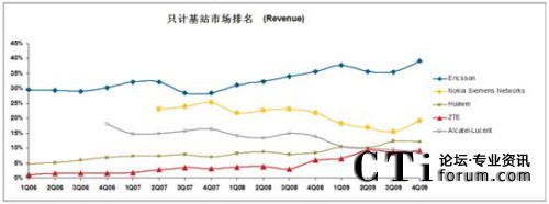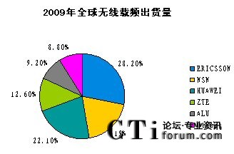 CTI論壇(ctiforum)4月16日消息(記者 潘婷婷): 近日,業(yè)內(nèi)著名調(diào)研公司Infonetics發(fā)布了2009年全球無線通信設(shè)備市場研究報(bào)告《2G/3G Mobile Infrastructure and Subscribers》。根據(jù)報(bào)告顯示,2009年全年,全球無線通信市場份額出現(xiàn)了較大變化,按載頻計(jì),中興通訊全年以12.6%的全球市場份額超越阿爾卡特-朗訊,居行業(yè)第4,按載頻計(jì),2009年全球無線設(shè)備出貨市場份額排名為愛立信、華為、諾基亞-西門子、中興、阿爾卡特-朗訊,分別為28.2%,22.1%,19%,12.6%和9.2%。