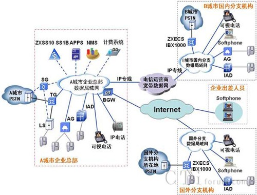 隨著大企業(yè)業(yè)務(wù)的不斷擴(kuò)大,在其他地區(qū)會建立一些分支機(jī)構(gòu)。針對這些需求,中興通訊推薦IP-PBX的多媒體組網(wǎng)方案,方案如下:
