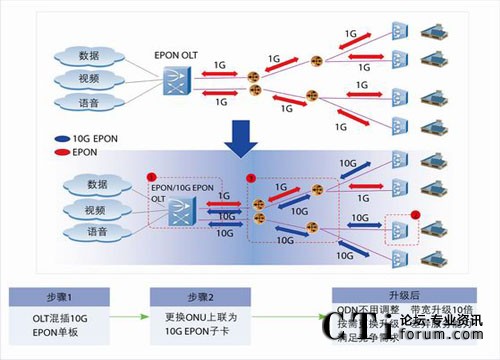 項目選取的試點小區(qū)建設于2006年,原來規(guī)劃的是每用戶6M帶寬。后期小區(qū)實裝率高,實際用戶超過1500戶,IPTV業(yè)務申請量提升后,出現(xiàn)了高峰時段IPTV點播業(yè)務不流暢、同時應用IPTV和上網(wǎng)業(yè)務時網(wǎng)速過慢等問題。而且當湖北電信新推出10M~20M的新寬帶套餐時,該小區(qū)用戶申請新套餐數(shù)量受限。該小區(qū)的寬帶接入網(wǎng)絡已經明顯無法滿足用戶日益增長的需求,寬帶提速正當其時。選擇10G EPON,能夠簡單兩步,將小區(qū)接入方式從EPON平滑升級為10G EPON,無需改變網(wǎng)絡結構,只需簡單升級設備(見圖)。
