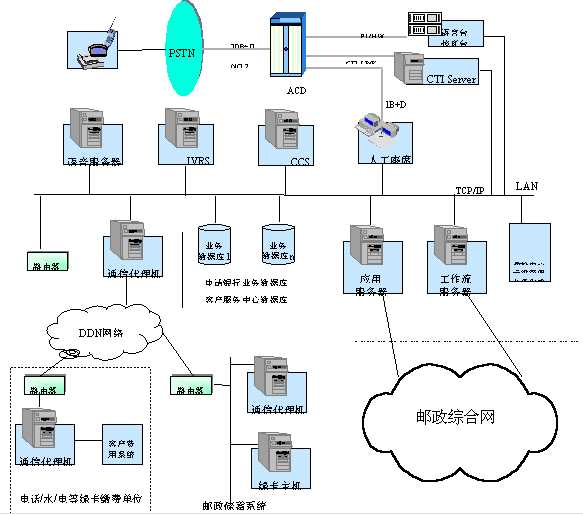 郵政呼叫中心在現(xiàn)有郵政綜合網(wǎng)的基礎(chǔ)上,利用電話服務(wù)廣泛普及,方便快捷的優(yōu)點(diǎn),采用CTI技術(shù),把綜合網(wǎng)提供的諸多并行的多種業(yè)務(wù)無縫集成,為綜合網(wǎng)提供一個(gè)集成多種服務(wù)功能為一體的橫向服務(wù)。