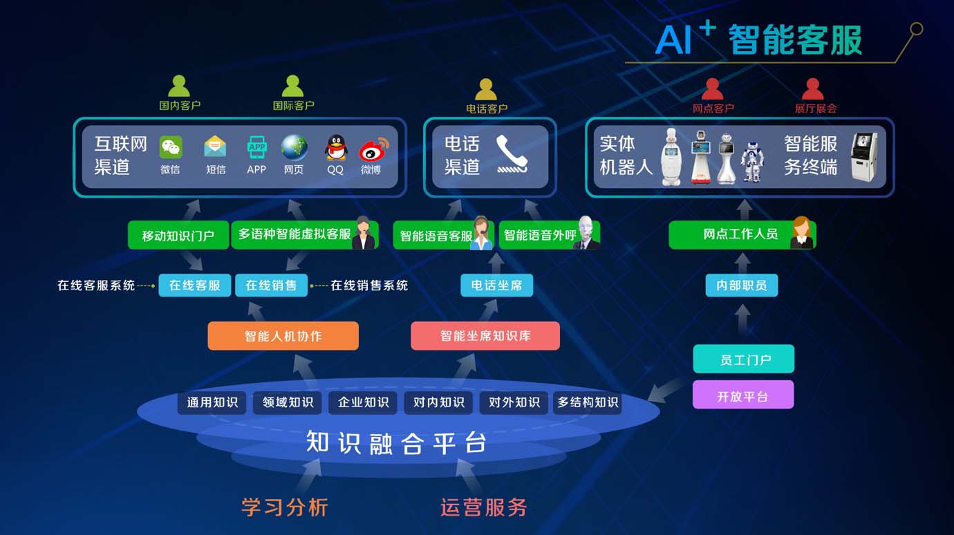 多種渠道融合:覆蓋網(wǎng)頁(yè)、微信、短信、APP、實(shí)體機(jī)器人等多種客服渠道,通過(guò)文本、語(yǔ)音、圖像等不同展現(xiàn)方式,充分利用互聯(lián)網(wǎng)和移動(dòng)設(shè)備,與用戶之間進(jìn)行溝通交互