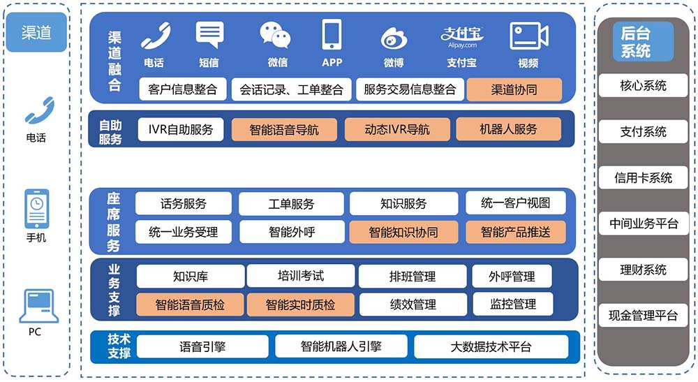 智能鑒權(quán)、智能語(yǔ)音導(dǎo)航、智能路由、智能知識(shí)庫(kù)匹配、智能質(zhì)檢、智能外呼