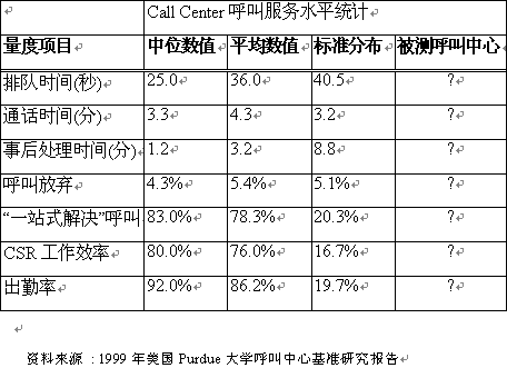 以下是Purdue大學(xué)1999年Benchmarking研究報(bào)告的部份內(nèi)容,顯示了美國分別在15個不同行業(yè)的Call Center的基準(zhǔn)測試數(shù)據(jù)。
