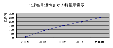 。。2001年全球的短消息服務(wù)業(yè)得到了迅猛的發(fā)展,全球共發(fā)送短消息2000億條。在中國(guó)短消息服務(wù)市場(chǎng)中,中國(guó)移動(dòng)在2001年發(fā)送短消息159億條,中國(guó)聯(lián)通發(fā)送短消息30億條。隨著中國(guó)移動(dòng)和中國(guó)聯(lián)通之間的互聯(lián)互通,中國(guó)短消息市場(chǎng)在2002年將達(dá)到300億條。并且中國(guó)電信和中國(guó)網(wǎng)通也加入到此市場(chǎng)中,中國(guó)固話短消息也將在此市場(chǎng)中占有一席之地。 中國(guó)的移動(dòng)用戶在2002年4月已經(jīng)到了1.6億戶,并且還在以500萬戶/月的速度發(fā)展,估計(jì)到2005年中國(guó)的移動(dòng)用戶將達(dá)到4.5億戶,中國(guó)手機(jī)用戶在35歲以下的占80%左右,他們是使用短消息的主體人群,因此中國(guó)移動(dòng)短消息具有非常大的發(fā)展?jié)摿Α?/p>