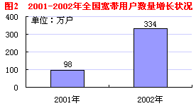 易觀咨詢的電信分析師顧先立說,固網(wǎng)市場的飽和與移動通信對固網(wǎng)的替代使得中國電信、中國網(wǎng)通這兩家固網(wǎng)運營商向新業(yè)務(wù)求助,主要是由DSL(數(shù)據(jù)用戶線)技術(shù)推動的寬帶接入業(yè)務(wù)來帶動整體收入的增長;而且,運營商希望能通過寬帶接入向用戶提供將來能帶來更多收入的增值業(yè)務(wù)。在前述動機和積極推廣下,2000年起,寬帶用戶數(shù)大幅增長。截至2002年底,全國4850萬互聯(lián)網(wǎng)用戶中有334萬寬帶用戶,而2001年底為98萬用戶數(shù),去年凈增236萬。中國電信2002年顯示,其寬帶用戶增長了98.2萬,達到137.9萬,較2001年底增長247.4%。今年,中國電信集團和中國網(wǎng)通的目標是總共增加370萬寬帶用戶,達到700萬。