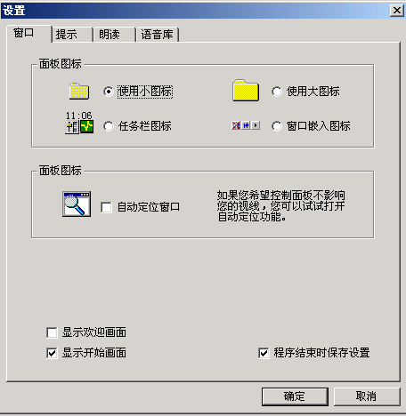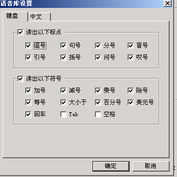 如果需要進(jìn)一步的調(diào)整,可以選擇菜單里的“設(shè)置……”。打開設(shè)置窗口(如圖3)。窗口共分四個選項(xiàng),每個選項(xiàng)里除了剛介紹的幾種常用功能調(diào)整外,還可以控制歡迎畫面、開始畫面、設(shè)定存儲等功能,規(guī)定提示速度、朗讀速度的快慢,選擇提示方式,設(shè)定提示報(bào)警條件。在“語音庫”選項(xiàng)中還可以選擇朗讀為男聲還是女聲。單擊“設(shè)置”按鈕,可以根據(jù)具體需要選擇“鍵盤”或“中文”里被朗讀標(biāo)點(diǎn)符號的種類(如圖4)。