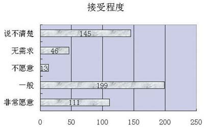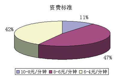 在調查中,67.4%的用戶對現有中國電信的資費標準(10元/分鐘)表示不滿,32.6%的用戶表示滿意。但同時58%的用戶對能接受的資費標準上又選擇了居中和較高的資費標準,表明用戶對視訊應用產品的價格承受能力較高。