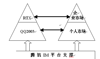 1、從QQ2003到RTX是對IM市場的全方位介入。騰訊推出革命性的QQ2003,緊接著又啟動RTX新品牌進軍企業(yè)市場,標(biāo)志著其不滿足于將自身定位為娛樂及時信息平臺和服務(wù)提供商,而是對商務(wù)市場和個人市場進行理性細分后的一種戰(zhàn)略決策,向兩類不同的用戶推出不同的品牌,提供不同的服務(wù)(如下圖),既保證了不同用戶的需求特質(zhì),又有效避免了品牌混亂。