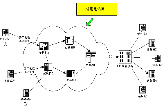 - CTI系統(tǒng)的將以企業(yè)(B)的名義對(duì)客戶(A)進(jìn)行接續(xù)服務(wù),該服務(wù)可以是語(yǔ)音服務(wù),傳真服務(wù),人工服務(wù),可以是客戶定制的語(yǔ)音系統(tǒng),傳真服務(wù)系統(tǒng),會(huì)議系統(tǒng),技術(shù)支持系統(tǒng)等等。