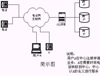 該業(yè)務(wù)方法涉及一種用戶電話轉(zhuǎn)移到CTI(Computer Telephony Integration)語(yǔ)音服務(wù)系統(tǒng)的接續(xù)服務(wù)方法,其CTI系統(tǒng)通過接口連接于公用電話網(wǎng),用戶在CTI系統(tǒng)登記,選擇服務(wù)功能,相關(guān)信息存入數(shù)據(jù)庫(kù),用戶電話設(shè)置轉(zhuǎn)移;當(dāng)客戶呼叫已轉(zhuǎn)移用戶電話時(shí),自動(dòng)接入CTI語(yǔ)音系統(tǒng),請(qǐng)求相關(guān)信息,對(duì)信息進(jìn)行分析判斷、處理,查詢數(shù)據(jù)庫(kù)用戶信息,以用戶名義進(jìn)行接續(xù)服務(wù)。其完全避免了傳統(tǒng)CTI系統(tǒng)的專用特服號(hào)碼服務(wù)的弊端,充分利用了交換機(jī)的功能,以用戶的電話號(hào)碼為客戶提供語(yǔ)音、傳真、數(shù)據(jù)及人工接續(xù)服務(wù)。