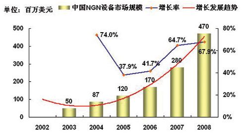 對于中國NGN市場規(guī)模的預(yù)測,主要取決于各個(gè)運(yùn)營商在NGN方面的戰(zhàn)略發(fā)展重點(diǎn),以及重點(diǎn)的投資方向?傮w上來說,從2003年起,以IPTV、VOIP、寬帶接入等業(yè)務(wù)為代表的NGN的部分業(yè)務(wù)的推廣,使得事實(shí)上中國已經(jīng)形成一定的NGN的市場規(guī)模,盡管這一市場規(guī)模仍然很小。2004年中國的NGN基礎(chǔ)設(shè)備的市場規(guī)模超過8千萬美元,以后隨著各個(gè)運(yùn)營商N(yùn)GN戰(zhàn)略的進(jìn)一步清晰,這一部分的投資會保持持續(xù)穩(wěn)定的增長,2005~2008年以后的NGN設(shè)備投資規(guī)模的平均增長率可以達(dá)到50%。