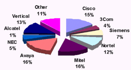 前面的一些統(tǒng)計(jì)數(shù)據(jù)是針對(duì)TDM PBX來(lái)說(shuō)的,那么敏迪在IP-PBX的表現(xiàn)如何呢?敏迪自從2001年推出第一臺(tái)IP-PBX--3300 ICP起,在IP-PBX市場(chǎng)占有率節(jié)節(jié)攀升,2004年第二季度在美國(guó)的發(fā)貨量已經(jīng)與Avaya并列第一位(見(jiàn)右圖,來(lái)自Infotech,2004八月)。根據(jù)Synergy Research Group (SRG) 的題目為"2005年第二季度的企業(yè)語(yǔ)音市場(chǎng)占有率"的研究報(bào)告,敏迪的銷售以季度20%的增長(zhǎng)率持續(xù)增長(zhǎng),增長(zhǎng)率超過(guò) Avaya,思科和北電在上一個(gè)季度的增長(zhǎng)率,鞏固了在中小型商業(yè)用戶市場(chǎng)的占有率排名第一的地位,并超過(guò)了在此領(lǐng)域的4個(gè)主要競(jìng)爭(zhēng)對(duì)手(3Com,Shoretel, Sphere和Vertical)占有率的總和。最近出版的Infonetics關(guān)于"2005年第二季度企業(yè)級(jí)IP-PBX全球市場(chǎng)分析和預(yù)測(cè)"的報(bào)告中將敏迪列為該季度世界上第二大IP-PBX供應(yīng)商,發(fā)貨量占21%,僅排在阿爾卡特之后,位列Avaya和北電之前,比去年同期增長(zhǎng)了2個(gè)百分點(diǎn)。