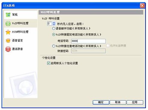 啟動(dòng) VoIP呼叫轉(zhuǎn)接固定電話功能,設(shè)置0秒啟動(dòng),轉(zhuǎn)接固定電話號碼為交換機(jī)內(nèi)置語音引導(dǎo)號8888,如圖,假設(shè)8888是交換機(jī)上配置的語音引導(dǎo)號。