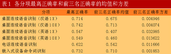 從各分項前三名的正確率方差可以看出,漢語桌面連續(xù)語音識別和嵌入式設(shè)備命令詞分項中各系統(tǒng)的性能差異較小,而英語桌面連續(xù)語音識別,特別是一倍實時任務(wù)中各系統(tǒng)性能差異較大。這是因為當前語音識別的研究重點在于前者,研究者較多,研究也比較深入,而英語的識別相對來說研究者較少。