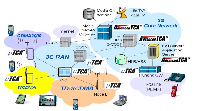3G網(wǎng)絡(luò)中占主要地位的三個(gè)無(wú)線(xiàn)接入標(biāo)準(zhǔn)是WCDMA、TD-SCDMA與CDMA2000。3GPP與業(yè)界廠商對(duì)網(wǎng)絡(luò)結(jié)構(gòu)的標(biāo)準(zhǔn)化做出的杰出努力,為在世界范圍內(nèi)成功布署3G網(wǎng)絡(luò)業(yè)務(wù)起到了至關(guān)重要的作用。不過(guò),3G網(wǎng)絡(luò)是復(fù)雜的系統(tǒng),包含有多種多樣的網(wǎng)元設(shè)備,AdvancedTCA與MicroTCA技術(shù)的出現(xiàn)把它的實(shí)現(xiàn)方式引向了標(biāo)準(zhǔn)化的道路,即通過(guò)商用組件快速、低成本地布署3G網(wǎng)絡(luò),減少了各種獨(dú)立的實(shí)現(xiàn)方式的復(fù)雜性,提高了互操作性。