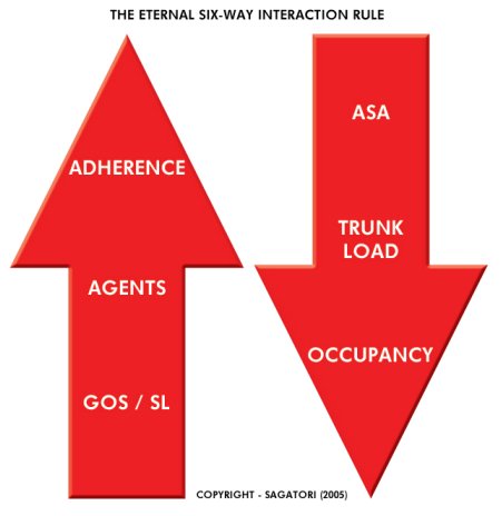 以Inbound坐席員為例,SAGATORI提出的KPI就只有兩個:日程遵守度和質(zhì)量。這里邊首先包含了對呼叫中心運行邏輯和動力傳遞機(jī)制的透徹理解。SAGATORI把它總結(jié)為“呼叫中心永恒不變的6條法則”,以下是一個簡單圖示(詳細(xì)解釋在此省略):