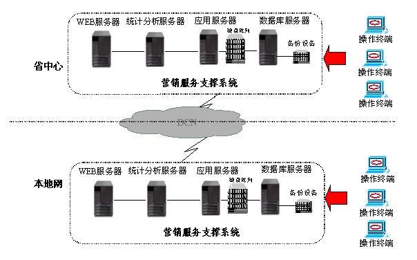 省中心/分公司營銷服務支撐系統(tǒng)由兩臺IBM服務器形成雙機集群,同時安裝有數(shù)據(jù)庫服務器、WEB服務器、應用服務器、統(tǒng)計分析服務器。