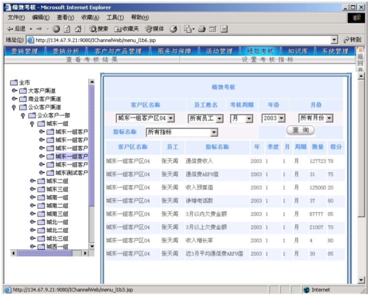 作為電信營銷服務支撐系統(tǒng),其主要功能是支撐營銷人員開展營銷活動,并通過功能完善的考核系統(tǒng)幫助各級人員進行工作管理。本系統(tǒng)可以對KPI指標進行靈活的設定,可以靈活定義多種參與考核的數(shù)據(jù)來源,使得各級主管能夠?qū)蛻艚M、社區(qū)(商業(yè)客戶區(qū)、農(nóng)村統(tǒng)包區(qū))的營銷服務工作進行考核評分?己酥芷诳梢酝ㄟ^參數(shù)進行設定(一般以月為單位)。