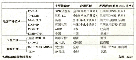 有分析師認為,從目前已經投入市場的移動電視技術來看,DVB-H和MediaFLO具備了大范圍普及的條件,這兩項技術具備了容納數(shù)千萬用戶的能力,但是其它的移動電視標準也正在逐步發(fā)展起來。對于運營商來說,目前重要的是,應該選擇何種標準發(fā)展移動電視。專業(yè)咨詢公司Ovum近日稱,運營商如果想在三年后擁有能有效傳輸流行內容的網(wǎng)絡,他們現(xiàn)在就要對移動電視的未來發(fā)展道路作出決定。Ovum認為,三年后單靠3G網(wǎng)絡可以支持的帶寬也將不能滿足需求。因此,許多分析師認為今年將是運營商圍繞移動電視標準而決策的關鍵之年。目前,對于運營商來說,盡早確定未來發(fā)展道路成為當務之急。