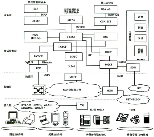 接入層支持各種有線和無(wú)線終端。固定和無(wú)線SIP終端可通過(guò)IP接入網(wǎng)直接鏈入,非SIP終端(如H.323)必須通過(guò)TAI(終端適配接口)完成H.323和SIP的轉(zhuǎn)換才能接入IP接入網(wǎng)。各種寬帶IP終端可通過(guò)MGW、MGCF、SGW實(shí)現(xiàn)與PSTN/PLMN域的傳統(tǒng)窄帶TDM(時(shí)分復(fù)用)終端實(shí)現(xiàn)互通。