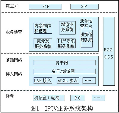 IPTV業(yè)務(wù)系統(tǒng)架構(gòu)可分為四層: 第三方業(yè)務(wù)提供者如CP和SP、業(yè)務(wù)運(yùn)營層、網(wǎng)絡(luò)承載層和用戶終端層(如圖1)。