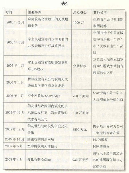從2003年開始,國內(nèi)就顯現(xiàn)出并購增值服務(wù)運(yùn)營企業(yè)的苗頭。2004年以來,隨著整治增值服務(wù)運(yùn)營企業(yè)的力度不斷加大,并購漸成風(fēng)潮(見表1)。2004年2月,新浪收購深圳網(wǎng)興科技公司;2004年5月,搜狐收購手機(jī)WAP服務(wù)提供商北京吉菲爾公司。2005年,在“超級(jí)女生”節(jié)目大獲成功后,掌上靈通宣布將對(duì)國內(nèi)著名的九天音樂網(wǎng)進(jìn)行戰(zhàn)略投資,全面打造“中國正版數(shù)字音樂第一門戶”和“無線百老匯”品牌。各大移動(dòng)增值業(yè)務(wù)服務(wù)商通過并購競爭對(duì)手,門戶網(wǎng)站可以在移動(dòng)增值服務(wù)領(lǐng)域?qū)で笮碌耐黄,獲得可觀的利益,增強(qiáng)自身的競爭力。伴隨著3G商用的日益臨近和市場(chǎng)競爭的不斷加劇,主流SP(服務(wù)提供商)進(jìn)一步加快了資本購并和業(yè)務(wù)整合的步伐,整個(gè)SP行業(yè)將加速洗牌。經(jīng)過市場(chǎng)整合,主流SP將不斷做大做強(qiáng),而相當(dāng)多的缺乏市場(chǎng)競爭力的SP將被淘汰出局。