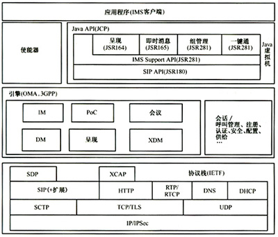 通過對于IMS客戶端相關(guān)規(guī)范的研究與分析,可以看出IETF提供了IMS客戶端所需要的協(xié)議部分,包括詳細的SIP信令消息交互,服務(wù)參數(shù)協(xié)商、媒體流的建立、XML文檔的交互等。3GPP和OMA提供了IMS客戶端所需要的服務(wù)引擎,與不同應(yīng)用服務(wù)器之間的交互方式以及如何接入到IMS網(wǎng)絡(luò)等。JCP提供了一整套IMS客戶端上Java應(yīng)用程序所需的標準Java應(yīng)用編程接口。由此可以總結(jié)歸納出IMS客戶端軟件架構(gòu)參考,具體參見圖2。