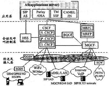 一般IMS分為三層,應用層支持各類應用服務器,負責為用戶提供增值業(yè)務和第三方業(yè)務。會話及呼叫控制層負責管理呼叫或會話設置,其中呼叫會話控制模塊CSCF完成呼叫網(wǎng)關(guān)功能、呼叫業(yè)務觸發(fā)功能和路由選擇功能,將SIP信令消息正確地轉(zhuǎn)發(fā)到應用服務器。歸屬用戶服務器HSS用于維護每個終端用戶獨有的業(yè)務屬性,包括IP地址、漫游信息、好友列表、呼叫業(yè)務定制信息及語音郵件設置等。HSS是全網(wǎng)可用資源。媒體資源功能MRF包括MRFP和MRFC,負責提供及控制媒體流資源,如播放通知音、媒體流的混合、編解碼等。媒體網(wǎng)關(guān)控制MGCF負責PSTN承載與IP流之間的連接,根據(jù)被叫號碼和來話情況選擇CSCF,并完成PSTN與IMS之間的呼叫控制協(xié)議轉(zhuǎn)換,如將從CSCF接收到的SIP消息轉(zhuǎn)換為MEGACO或ISUP消息,并通過IP發(fā)送到信令網(wǎng)關(guān)SGW。出口網(wǎng)關(guān)控制功能BGCF主要實現(xiàn)呼叫路由功能,為呼叫選擇適當?shù)腜STN接口點,若發(fā)現(xiàn)該接口點與自己在同一網(wǎng)絡,則選擇本網(wǎng)絡的MGCF與PSTN交互,若發(fā)現(xiàn)接口點在另一網(wǎng)絡時,BGCF將會話信令轉(zhuǎn)發(fā)給另一網(wǎng)絡相應的BGCF。一個IMS可以包含一個或多個CSCF、HSS、MGCF等功能模塊。傳送及接入層承載各種類型之間的轉(zhuǎn)換,完成與傳統(tǒng)PSTN/PLMN間的互通等功能,包括各類有線接入、無線接入、互聯(lián)互通網(wǎng)關(guān)等設備。