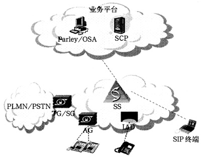 直接由SoftSwitch提供業(yè)務(wù),可提供基本電話業(yè)務(wù)、補(bǔ)充業(yè)務(wù)等;SoftSwitch具備SSP功能,通過SG與現(xiàn)網(wǎng)SCP互通,提供現(xiàn)有智能網(wǎng)業(yè)務(wù);SoftSwitch與應(yīng)用服務(wù)器之間通過SIP、H.323、Radius等協(xié)議互通;通過Parlay-GW/OSA-GW提供API接口,為第三方提供業(yè)務(wù)開發(fā)平臺。