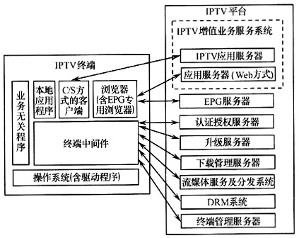 IPTV中間件是當(dāng)前IPTV業(yè)界關(guān)注的熱點之一。業(yè)界對于中間件沒有確切的定義,一般認為:中間件是實現(xiàn)異構(gòu)軟件實體間互連互通的一類軟件,則IPTV中間件就是實現(xiàn)IPTV系統(tǒng)中各個節(jié)點之間互連互通的一類軟件。IPTV系統(tǒng)中的節(jié)點類型眾多,包括終端、EPG(電子節(jié)目指南)服務(wù)器、內(nèi)容分發(fā)系統(tǒng)、業(yè)務(wù)管理系統(tǒng)、網(wǎng)管監(jiān)控系統(tǒng)、DRM(數(shù)字版權(quán)管理)、內(nèi)容管理系統(tǒng)、頭端系統(tǒng)等,除終端外,其他節(jié)點都可以統(tǒng)稱為平臺側(cè),因此IPTV中間件也可以分為平臺中間件和終端中間件兩類。平臺中間件實現(xiàn)系統(tǒng)平臺中各個應(yīng)用服務(wù)器之間的互連互通,終端中間件實現(xiàn)IPTV終端和系統(tǒng)平臺之間的互連互通。