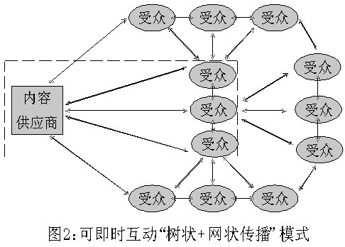 從傳播學角度分析,傳統(tǒng)媒體傳播方式是“樹狀傳播”,是點對面的單向傳播,即從一個信息源(樹根)向受眾(樹葉)作單向傳播(見圖1)。受眾(樹葉)向信息源(樹根)的反饋,是滯后的、非同介質(zhì)的(讀者來信、來電等),傳播和反饋不能同步進行。而新媒體的傳播方式則是“網(wǎng)狀傳播”,即它是一個漁網(wǎng)式的傳播網(wǎng),網(wǎng)上的任意一個節(jié)點,都可以向其他任意一個節(jié)點或節(jié)點群作點對點、點對面的單向或雙向互動式傳播,傳播者和受眾之間可以即時互動,信息反饋可以即時進行,傳和受的位置可以即時互喚。