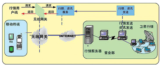 用戶(hù)借助無(wú)線終端通過(guò)無(wú)線接入網(wǎng)關(guān)登錄到移動(dòng)證券業(yè)務(wù)平臺(tái),移動(dòng)證券業(yè)務(wù)平臺(tái)根據(jù)無(wú)線終端的請(qǐng)求類(lèi)別提供實(shí)時(shí)的證券服務(wù)。
