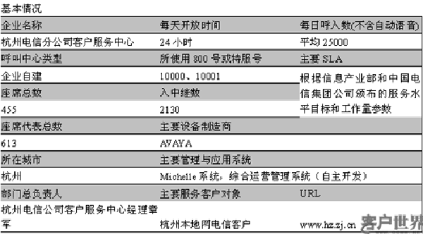浙江省電信有限公司杭州市分公司客戶服務中心(以下簡稱杭州電信客服中心,或者杭州電信10000號)成立于2002年9月,是一個基于CTI技術、充分利用通信網(wǎng)和計算機網(wǎng)絡的綜合信息服務系統(tǒng),以電話為主,輔之以傳真、短信、Email、互聯(lián)網(wǎng)等多種接觸媒體,通過人工、自助語音與網(wǎng)上服務的方式,為杭州400萬電信客戶提供綜合電信業(yè)務的咨詢、查詢、受理、投訴、報障和電話營銷。建有2130路中繼通道,1410路自動語音通道,186個人工服務座席、189個電話營銷座席、80個外包座席,占地5600多平米,分別位于杭州市惠興路9號和慶春路133號。