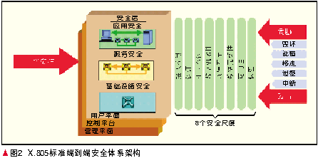 ITU-T在X.805標(biāo)準(zhǔn)中,全面地規(guī)定了信息網(wǎng)絡(luò)端到端安全服務(wù)體系的架構(gòu)模型。這一模型包括3層3面8個(gè)維度,即應(yīng)用層、業(yè)務(wù)層和傳送層,管理平面、控制平面和用戶平面,認(rèn)證、可用性、接入控制、不可抵賴、機(jī)密性、數(shù)據(jù)完整性、私密性和通信安全,