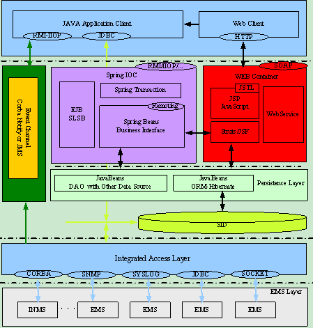 技術體系結構從下至上分為網元層、綜合接入層、持久層、業(yè)務邏輯層和展現層。網元層包括網元網管EMS或網元NE等,在系統(tǒng)內部統(tǒng)一按MO建模和管理。