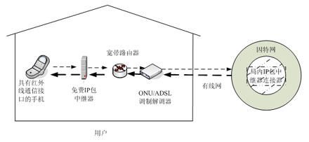 DoCoMo公司網里現有這類手機共37種),通過無線方式與免費IP包傳輸中繼器相連,免費IP包傳輸中繼器通過以太網經過寬帶路由器或通過PPPoE(Point
