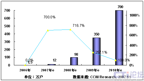 2008年,隨著3G在中國商用,以及奧運帶來豐富視頻內(nèi)容,將推動手機電視作為一項重要的移動增值業(yè)務(wù)將進入市場發(fā)展期;同時隨著網(wǎng)絡(luò)、終端、內(nèi)容、商業(yè)模式等因素的發(fā)展,產(chǎn)業(yè)鏈初步完善,看好手機電視業(yè)務(wù)的產(chǎn)業(yè)鏈各環(huán)節(jié)大力介入,北京奧運會將大大激發(fā)用戶使用手機電視業(yè)務(wù)的熱情,從而推動手機電視進入快速發(fā)展階段。根據(jù)計世資訊預(yù)計,2008年中國手機電視用戶將達到400萬。