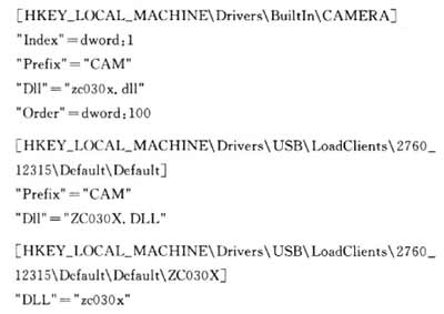 系統(tǒng)自動加載驅(qū)動程序時,首先要將驅(qū)動程序復(fù)制到\WINDOWS文件夾下,然后向注冊表中寫入攝像頭的驅(qū)動信息: